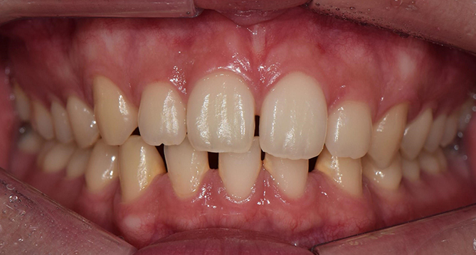 상실치아의 양 옆의 치아모양을 다듬은 후 여러개의 크라운